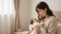 自宅で深呼吸とストレッチを行う産後の女性。朝の光が差し込み、隣で赤ちゃんが眠っている穏やかなシーン。