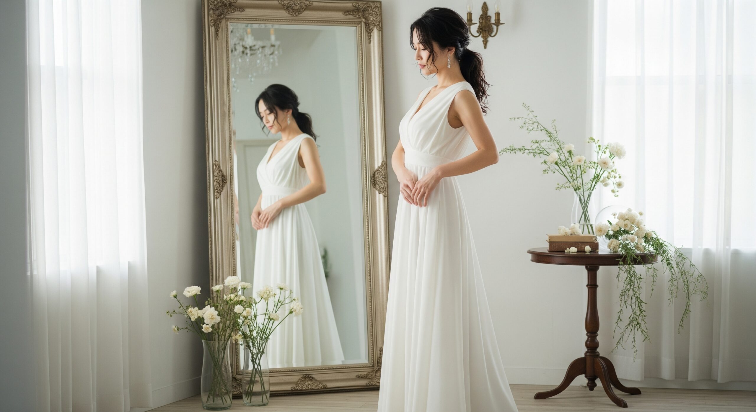 A. むしろ「体重よりも見た目」を意識した方が、撮影には効果的です。 特にスタジオウェディングでは、写真に写るのは数字ではなく“シルエット”や“姿勢”。 体重が大きく変わらなくても、二の腕や背中が引き締まり、姿勢が良くなるだけで印象が劇的に変わります。